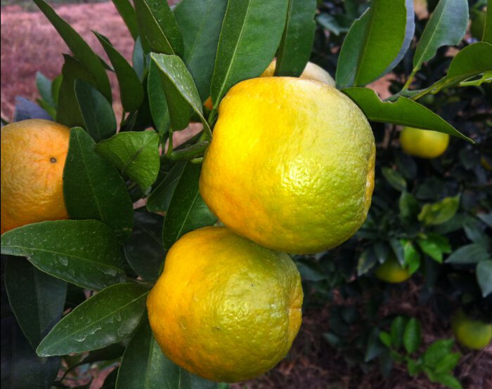 二、花與果實。病株花小,畸形花多,花期早或不定期開花,開花多而結(jié)果少,落花落果嚴重。病果形體小,皮硬難剝,味酸,部分病果蒂部扁歪突起,成熟后果蒂部分變成紅色,而果頂部分仍為綠色,形成“紅鼻子果”。
